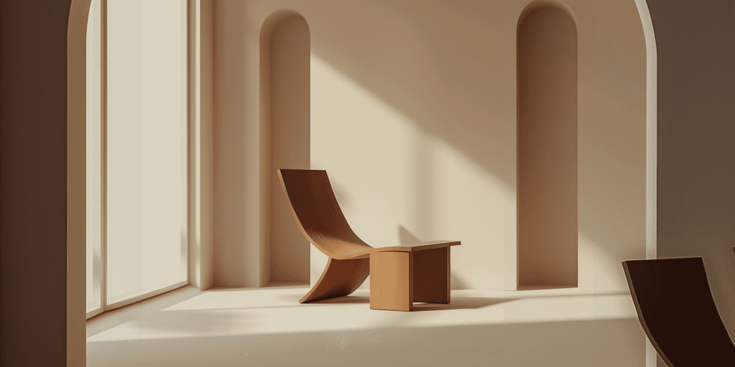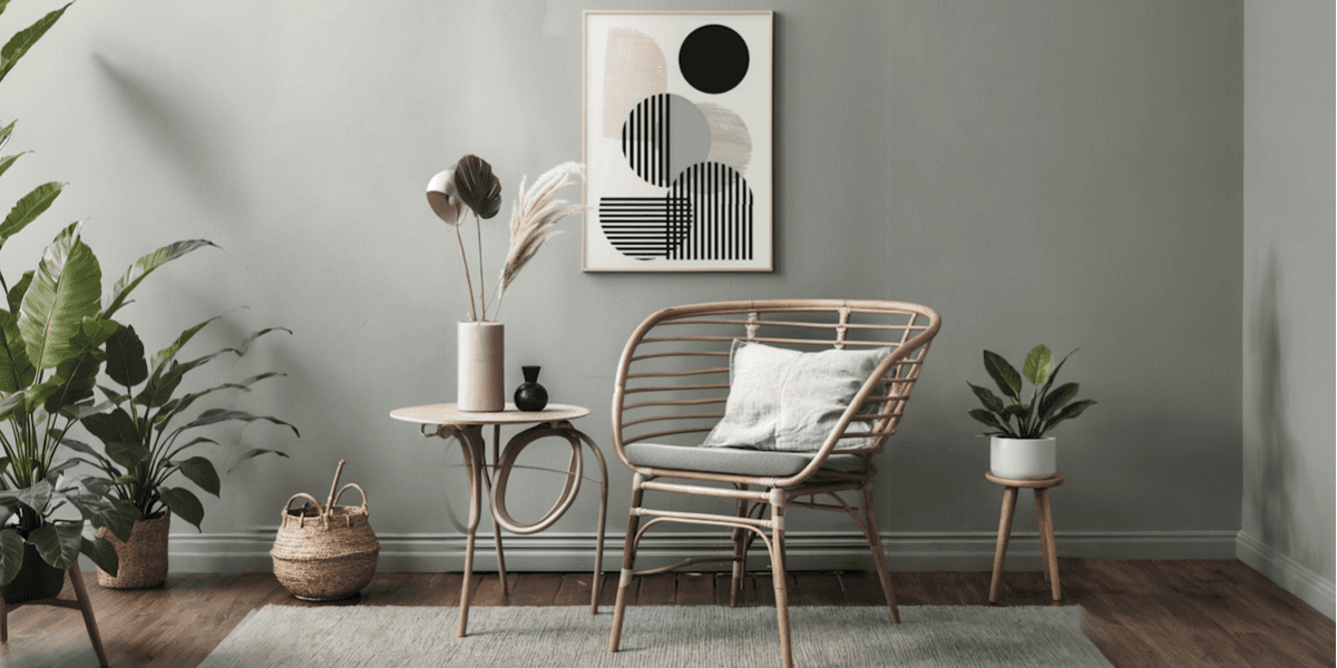 A calm suburban space that unites clean lines with organic material warmth.